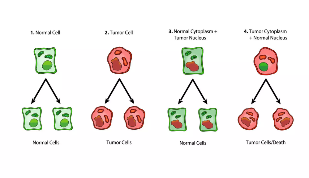 A series of fascinating studies were done in the early 2000s to further investigate the question of what’s really causing cancer’ by an American professor of biology, Dr. Thomas Seyfried. Was it damaged DNA? Or was it damage to the mitochondria which control cell respiration? So, this is what they did. They took some normal cells (far left) and some cancer cells (mid left). They removed the damaged mitochondria from the cancer cells and put them into the cells with healthy DNA (mid right). Then they took DNA from the healthy cells and put them into the cells with the damaged mitochondria (far right).